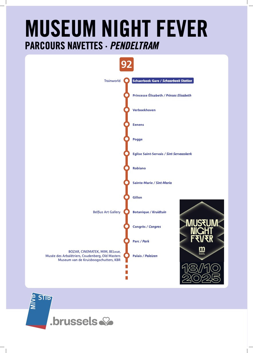 Op de kaart hieronder zie je de routes van de twee shuttlelijnen en de tramlijn 92 met de locatie van de haltes en de deelnemende musea. Voor elke halte geven we aan of het een permanente MIVB-halte of een tijdelijke halte is.